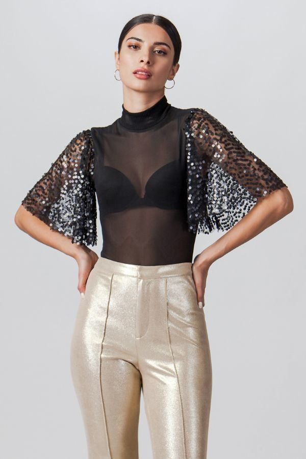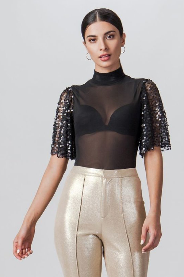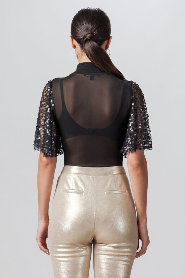 A sheer bodysuit featuring mock neck with short sequin flutter sleeves, bikini bottom cut with bottom snap buttons and fitted silhouette.